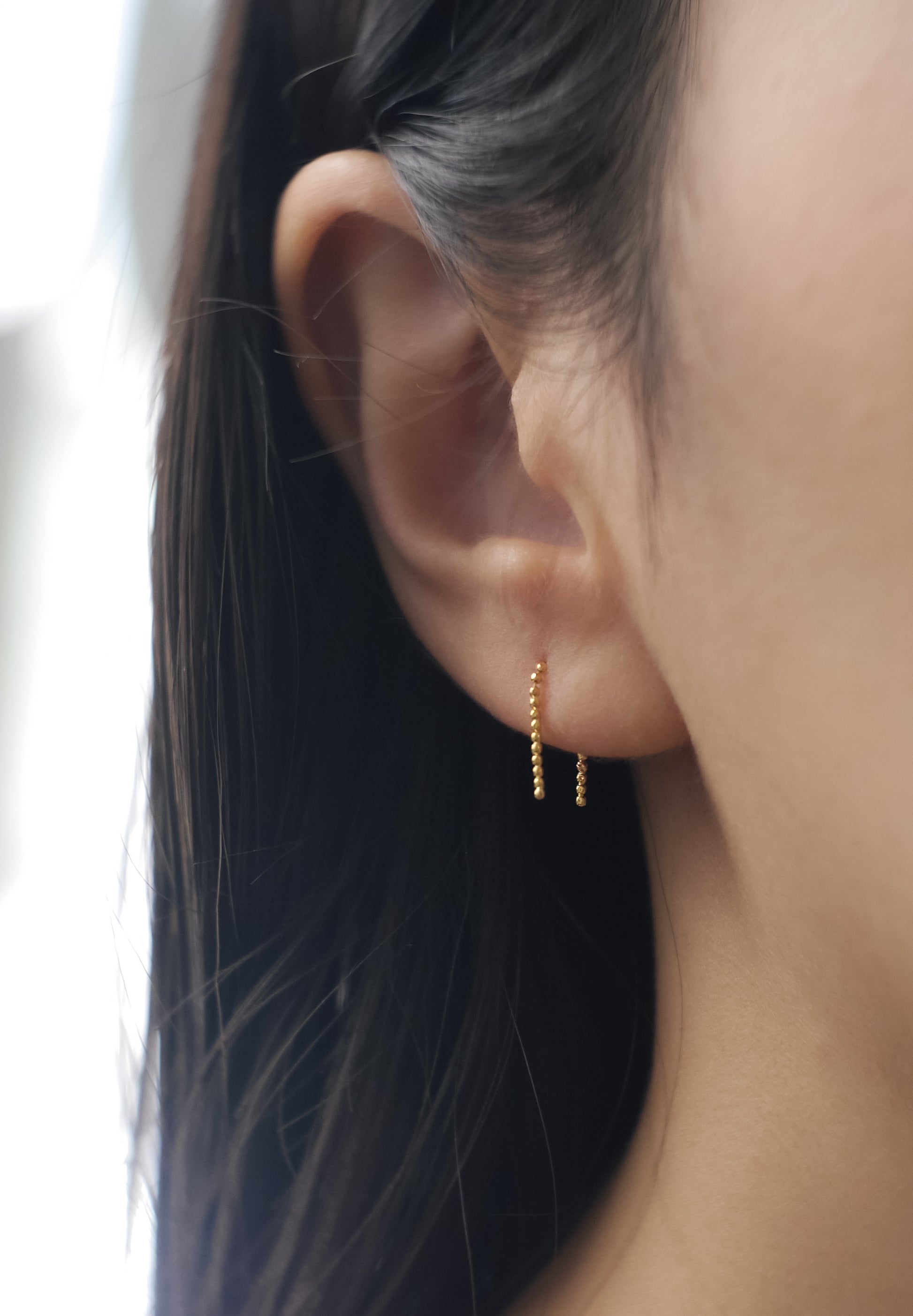 このピアス"null"は両端が直線の状態に固める加工が加えられており、装着するときにはキャッチとしての役割を果たし、且つ本体のピアスが抜けづらい仕様となっています。