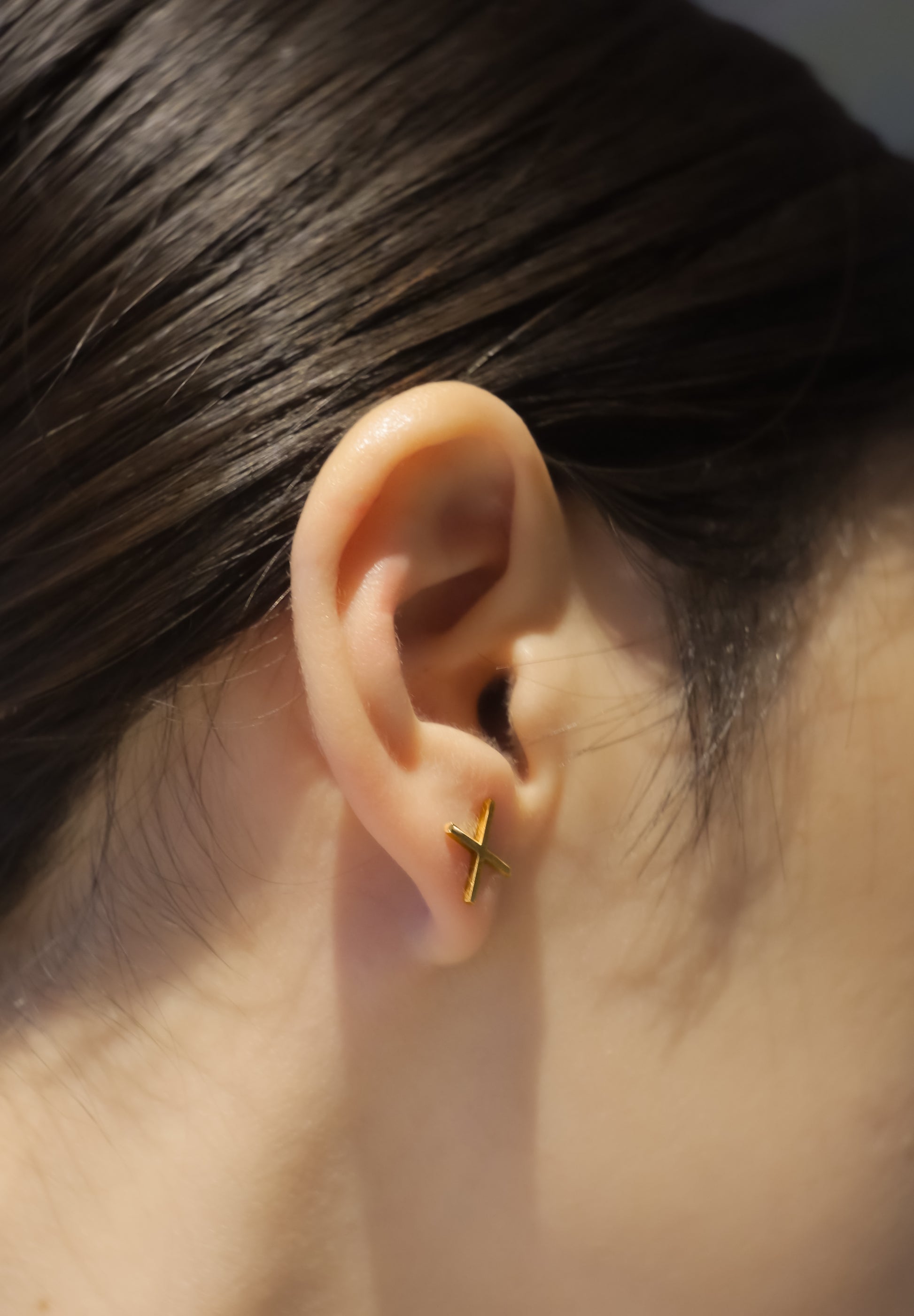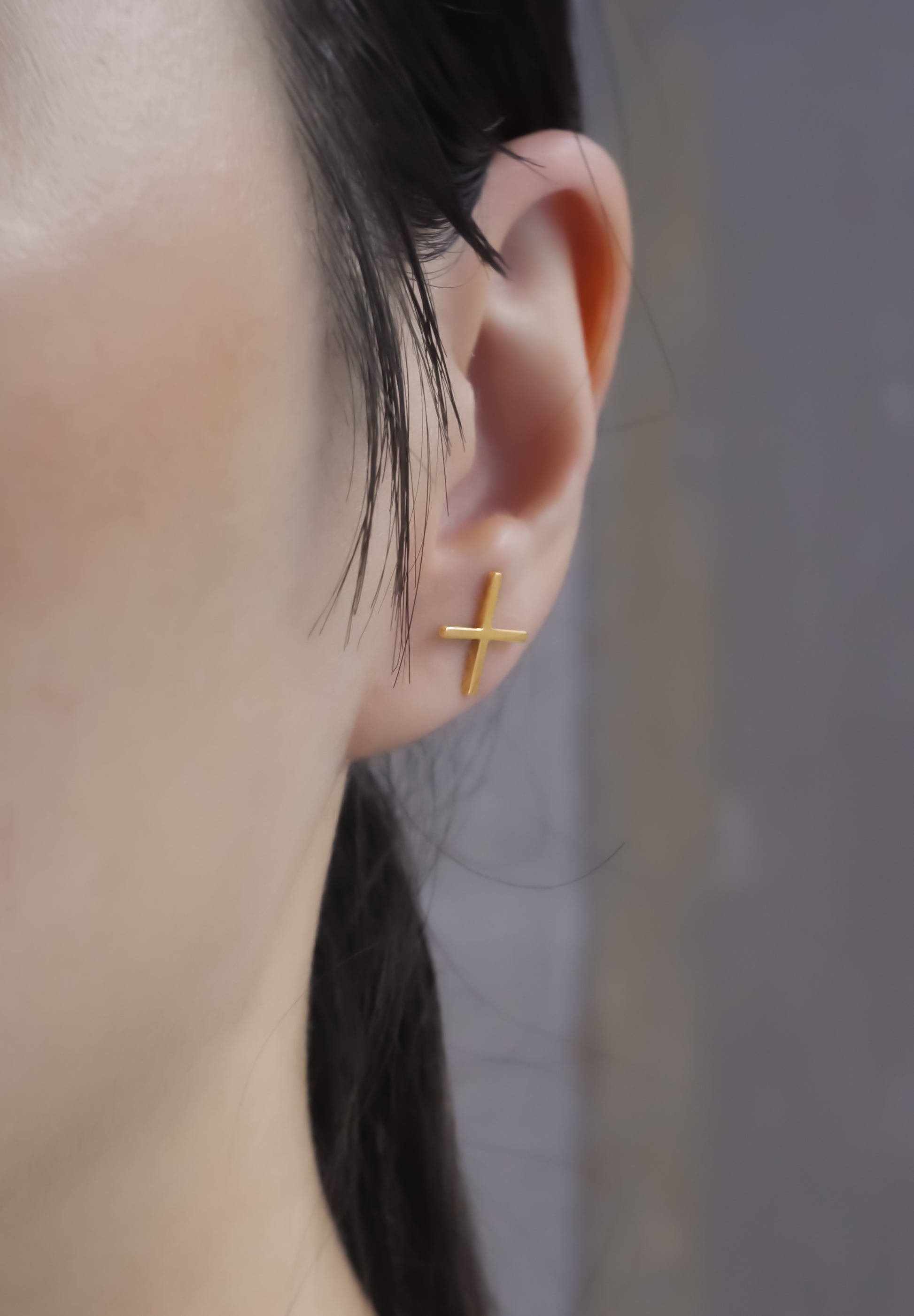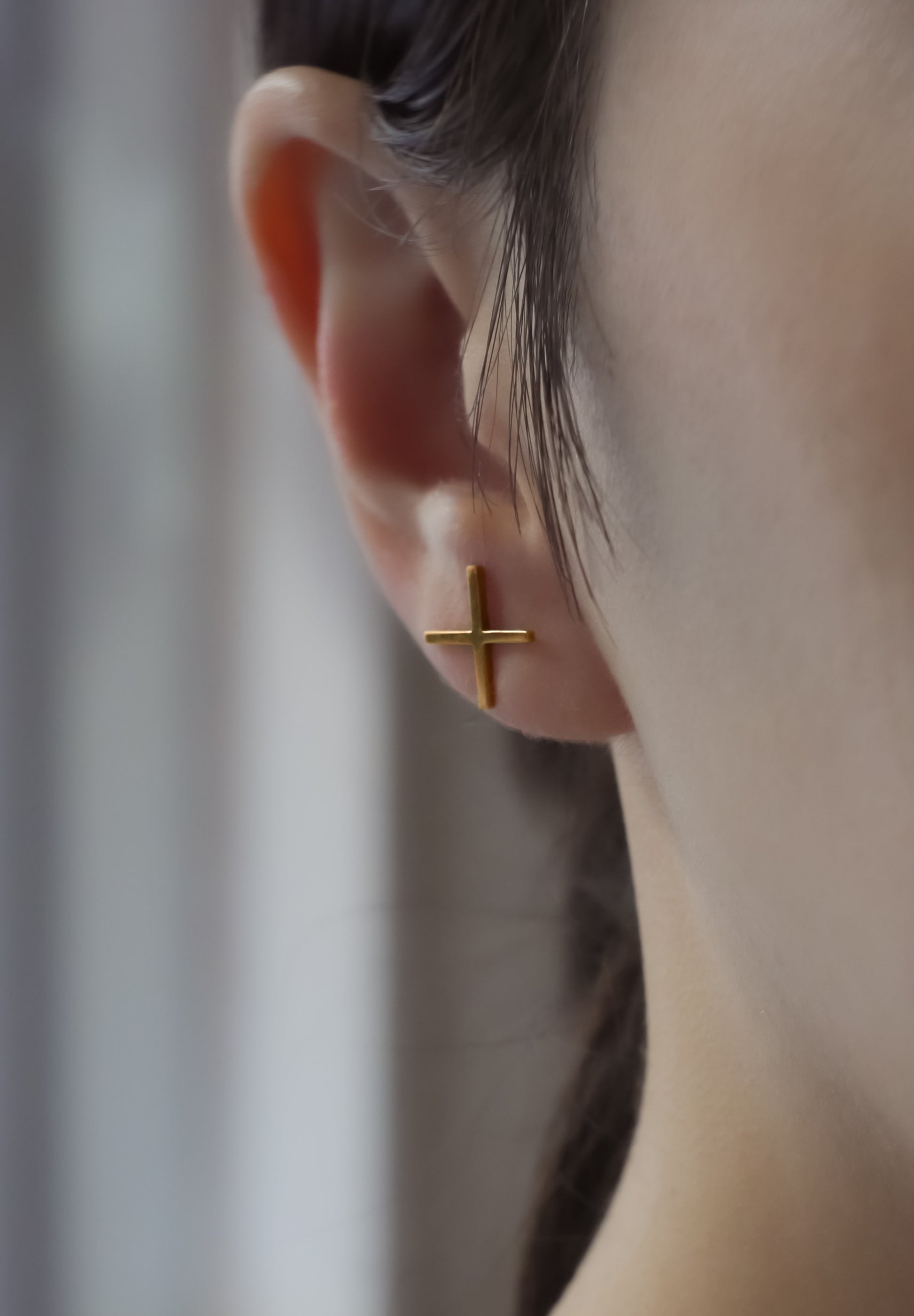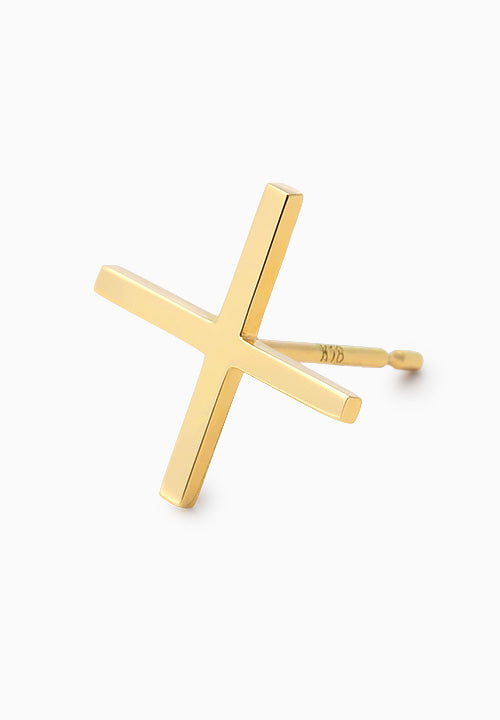 縦横が同じ長さのミニマルなクロスモチーフのピアス。記号のような幾何学的なフォルムは普遍性を表現し、神秘的な空気感と現代性を同時に孕んだアイテムです。