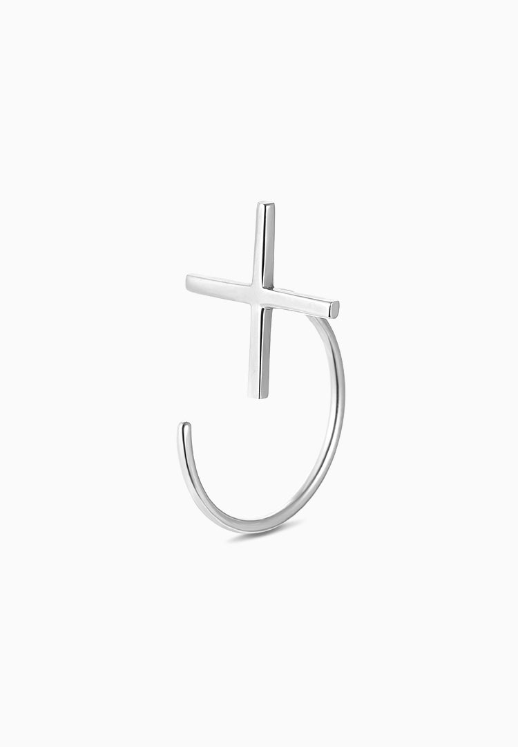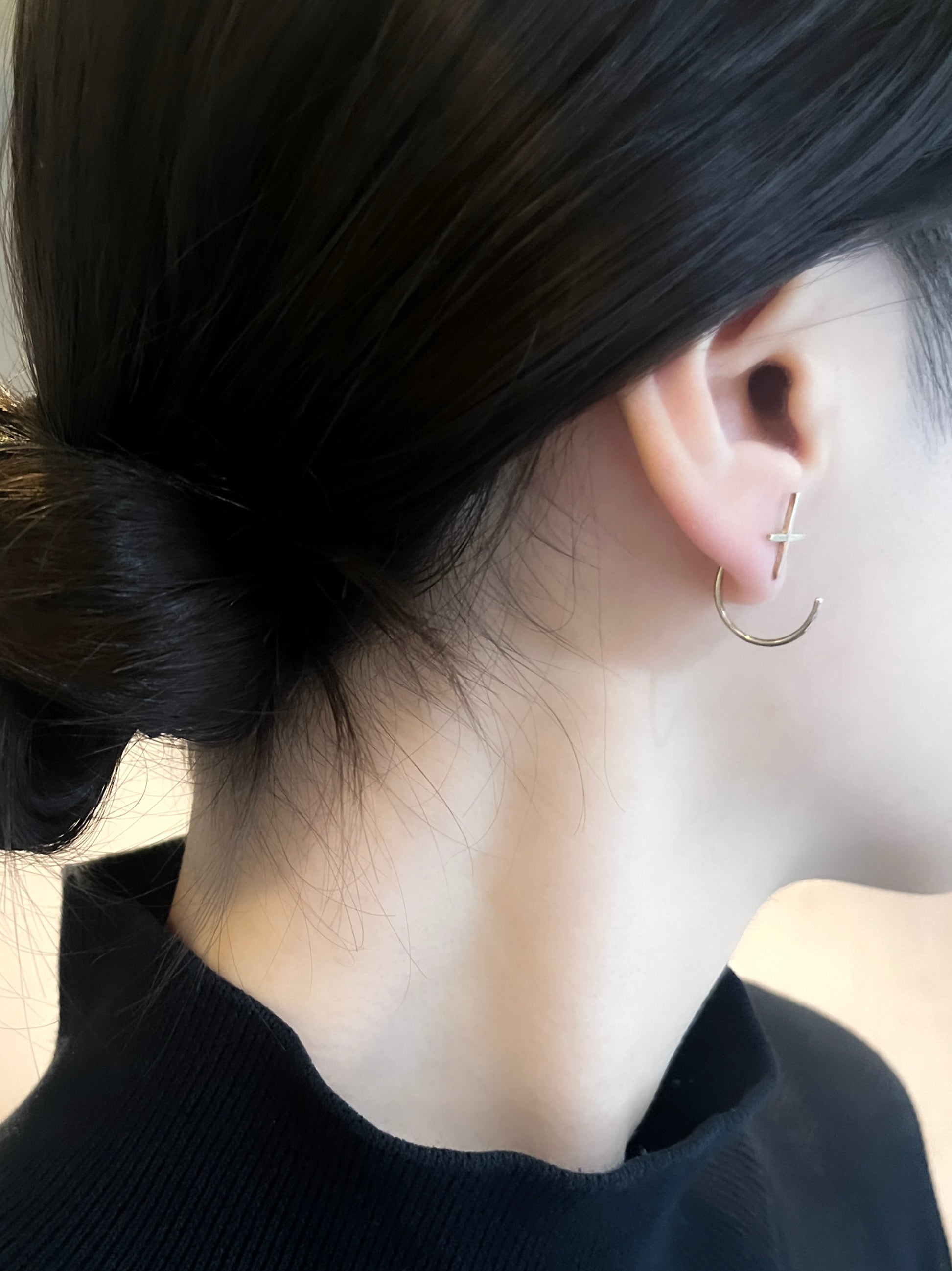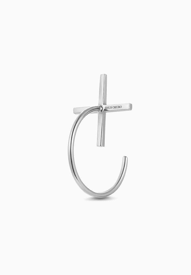 クロスモチーフのピアス。装着すると後ろから前にぐるっとフープ状のポストが前に回り込む立体的な構造です。幾何学を感じさせるフォルムと十字架が神秘的な雰囲気を表現します。