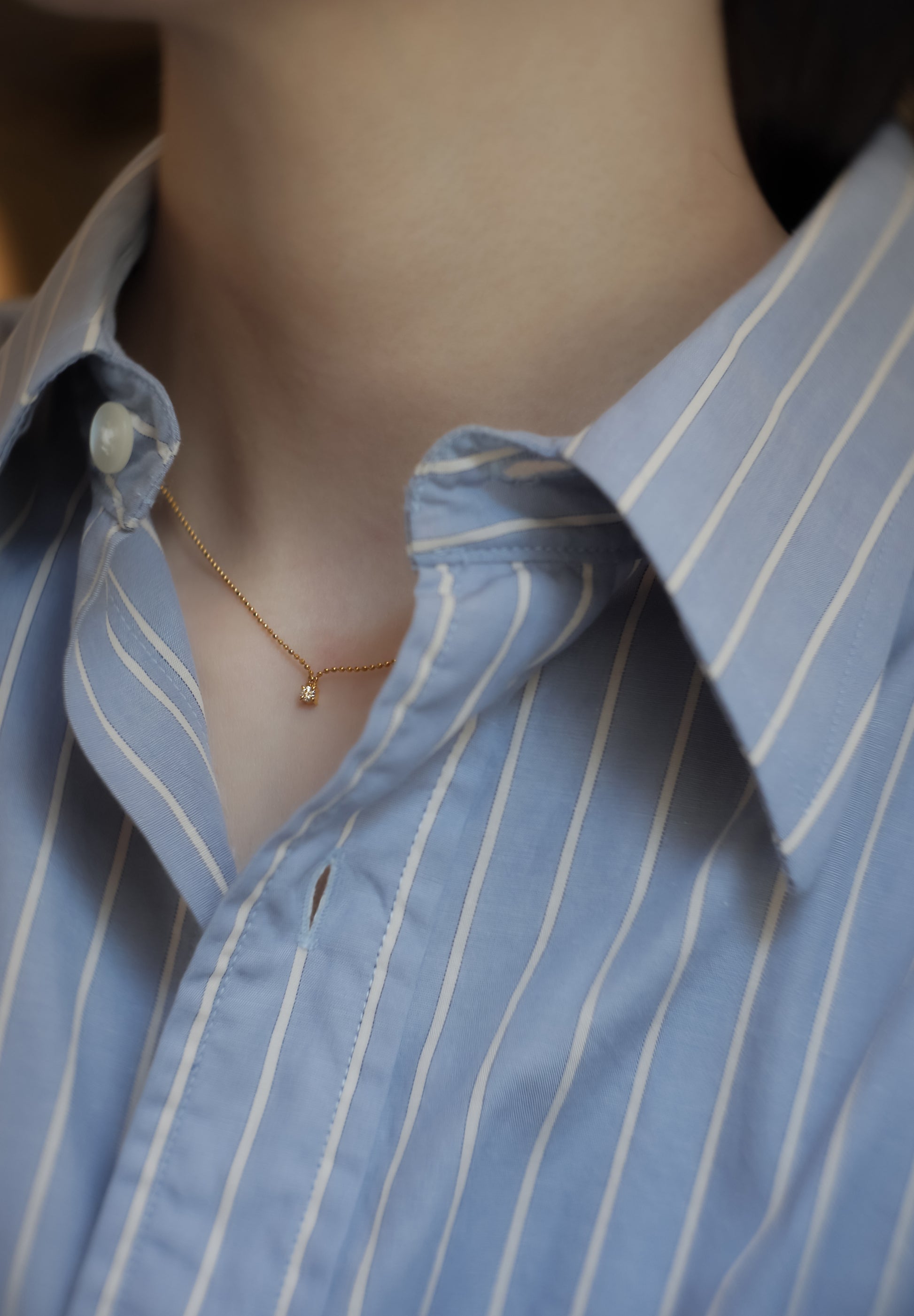 ClusterシリーズのDiamond Necklaceは極シンプルながら、チェーンがダイヤモンドに向かって細く流れる構造により華やかでありつつも繊細な優しい印象を与えます。