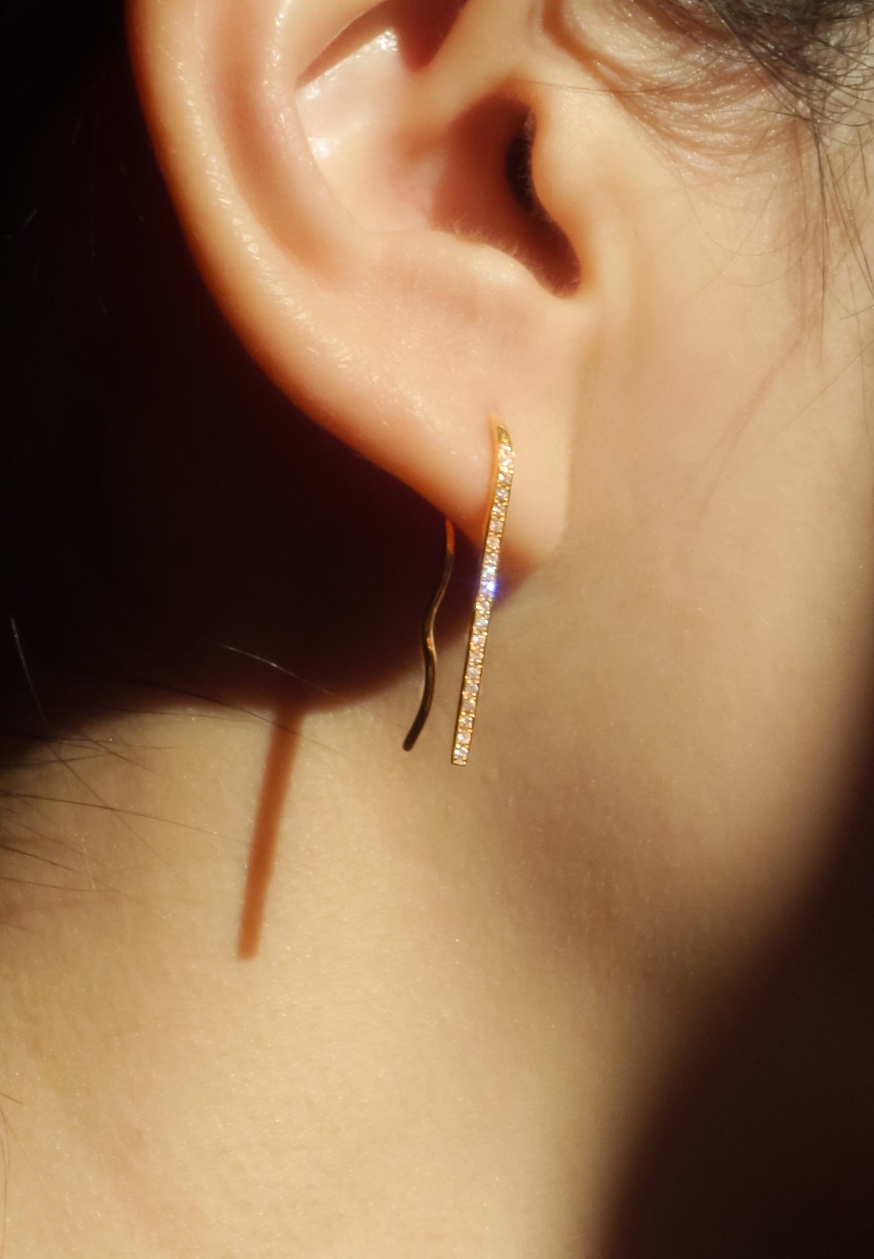バレエの演目"白鳥の湖"からインスパイアされたピアス "Swan Lake" の、装着時正面に向く面に極小のダイヤモンドを据えたバージョン。このピアスの形状はヘアピンから着想されており、バレリーナの女性達や、彼女たちが髪にヘアピンを付ける様をも想起させるアイテムです。うねった線は造形的にも美しいラインを形づくり、耳に装着した時にはさらに存在感のあるアクセントとなります。片耳でも、両耳でもバランス良く、K18とダイヤモンドがラグジュアリーな輝きを放ちます。